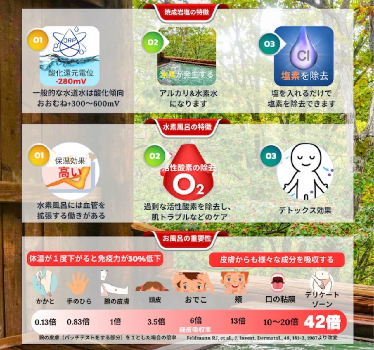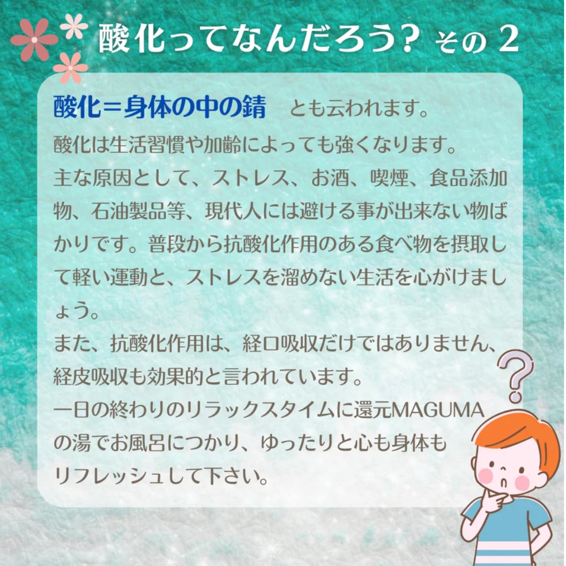 酸化したお湯で入浴すると、代謝不良や肌荒れの原因になると言われています。お風呂に『還元マグマの湯』を入れると水素が発生し、塩素を軽減します。